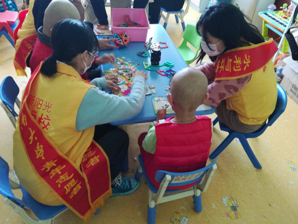 下午2点20分,志愿者们准时在学校新西门集合,一同乘车去往市儿童医院血液肿瘤科的“阳光病房”。为了给孩子们营造一个安全无菌的环境,让孩子们放心地玩耍,志愿者们首先对教室环境进行全面消毒。下午3时左右,孩子们陆陆续续在家长的引领下走进了阳光病房,志愿者们正式开始上课。也许是病痛的折磨,有的孩子几乎不说话,只是静静地摆弄着拼图。不过志愿者们也不强求孩子们说些什么,只是安静地陪着他们一起玩并且不时地讲一些有趣的事情。也许是志愿者们的热情感染了孩子们,孩子渐渐开始对志愿者们打开心扉,话也多了起来。