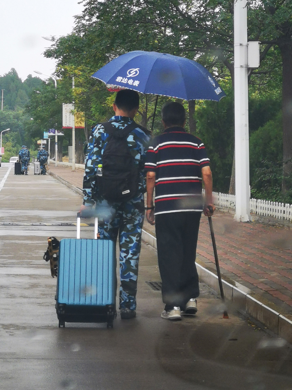 视频中,一位身穿军训服的大学生在雨中为一拄着拐杖的老人撑起雨伞,一路陪伴老人回家,据了解,这位同学是济南大学信息科学与工程学院的大一新生,名叫秦庆龙。当天正值学校领书的时间,视频中的庆龙左手拉着装满新书的沉甸甸的行李箱,右手替老人打着伞,他的行为也成为了雨中最美丽的风景。