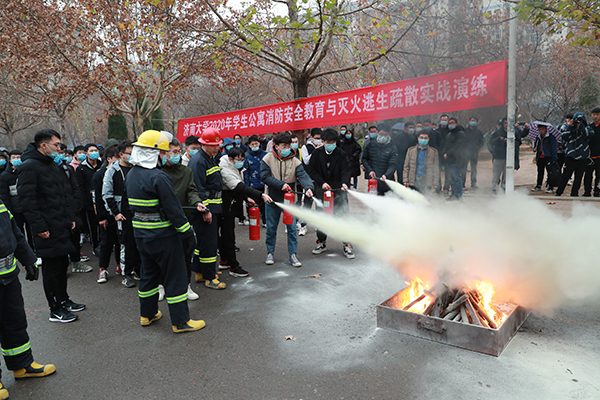 消防演练活动中,学25号公寓学生按照演练要求有序疏散到指定地点,安全管理处工作人员对参加演练师生进行了安全教育和逃生疏散的技巧,现场演示了灭火器的使用方法。参加演练的师生在安全管理处专业人员的指导下,依次进行了灭火实战演习,300余名师生参加了消防演练活动。
