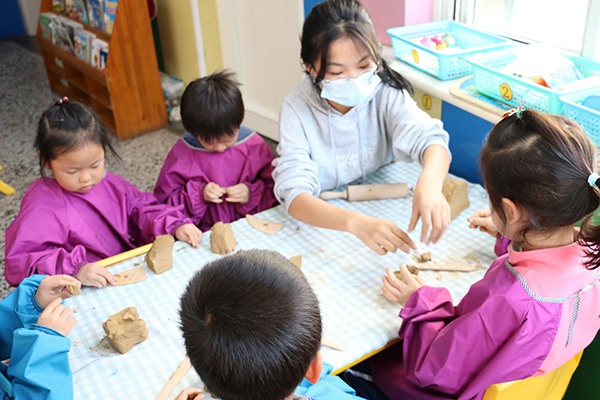 活动准备阶段,参与活动的志愿者们认真学习陶泥的历史文化,并进行了简短的培训,强调了注意事项和纪律问题。下午2时许,陶协的志愿者们携带制作材料抵达济大幼儿园,幼儿园老师带领孩子们在园门口热烈欢迎今天的陶艺老师们。随后幼儿园老师带领孩子们更换服装,陶协成员负责布置场地,并将准备好的陶泥分发到每个小朋友手中。捏泥之前,由陶协成员给小朋友们介绍陶瓷艺术的起源。孩子们对陶泥制作具有浓厚兴趣,都好奇地询问陶泥的做法、用途等。小朋友们认真听取讲解后,纷纷发挥自己的创意,动手体验陶泥的制作,专心学习制作陶泥的过程,在陶协成员和幼儿园老师的帮助下制作出一个又一个生动形象的动物、植物等。最后,小朋友们与陶艺老师们合影留念。