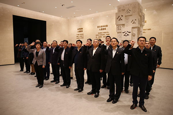 在工作人员引导讲解下,参加活动的领导干部依次参观了序厅、主展厅、宣誓厅和廉政文化专题展厅,系统回顾了党的百年反腐历史和加强纪律建设的光辉历程,全面了解了党的十八大以来山东全面从严治党、党风廉政建设和反腐败斗争的部署、做法和成效,观看了山东省近年来查处的违纪违法典型案例和教育情景短剧,认真学习了齐鲁传统文化中的廉政思想、廉政实践和家规家训。在宣誓厅,校党委书记刘春华带领全体党委委员面向党旗庄严宣誓,重温入党誓词,感悟初心使命。