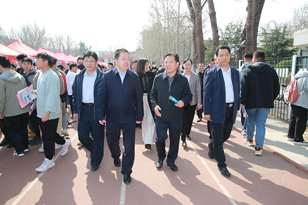 济南市委组织部副部长、市人力资源和社会保障局局长宁延学,市人力资源和社会保障局党组成员、市公共就业服务中心主任王振群,市中区副区长张源,济南大学校长刘宗明、党委副书记杨景波等来到招聘会现场,在展位前与用人单位、求职学生进行交流。