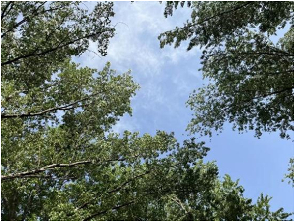 伴月桥前有一片林木,每当走到它前面我就会驻足,桥前的树有十几米高,显得在伴月桥边站着的我是如此的渺小,微风吹过,树叶哗啦啦的像是绿色的精灵在跳唱着圆舞曲,偶尔飘过的几片白云与满满点点的绿叶在又高又远的蓝蓝天空中轻摇,蓝,白、绿的配色,是旷远,是恬淡,是生命。